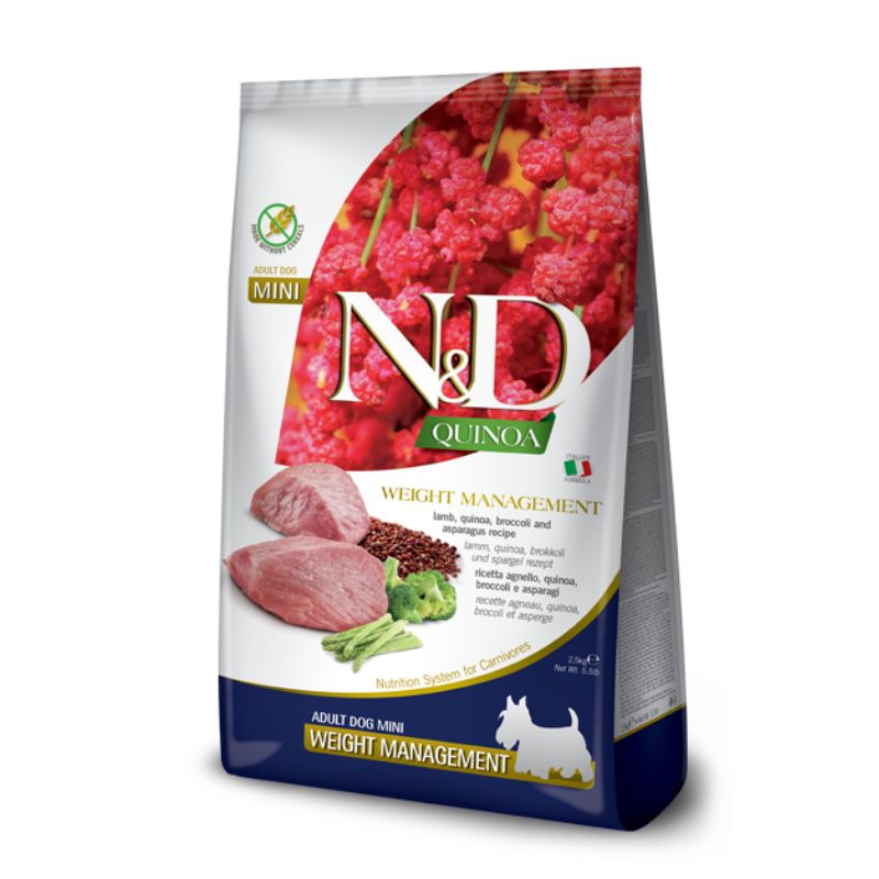 מזון יבש מלא לכלבים בוגרים מגזע קטן המסייע בהפחתת משקל גוף עודף. סדרתהקינואה של N&D מכילה מזון יבש ושימורים. היא תזונה פונקציונאלית ללאדגנים לכלבים וחתולים בעלי צרכים תזונתיים מיוחדים. הקינואה נחשבת כמזוןעל, בעלת חלבון איכותי וערך ביולוגי גבוה. בסדרה מוצרים עם מקור חלבוןיחיד: צבי, דג הרינג, ברווז . בתוספת של פירות, ירקות וצמחי מרפא יחודיים.מזון ייעודי – יש להיוועץ ברופא וטרינר לפני השימוש.